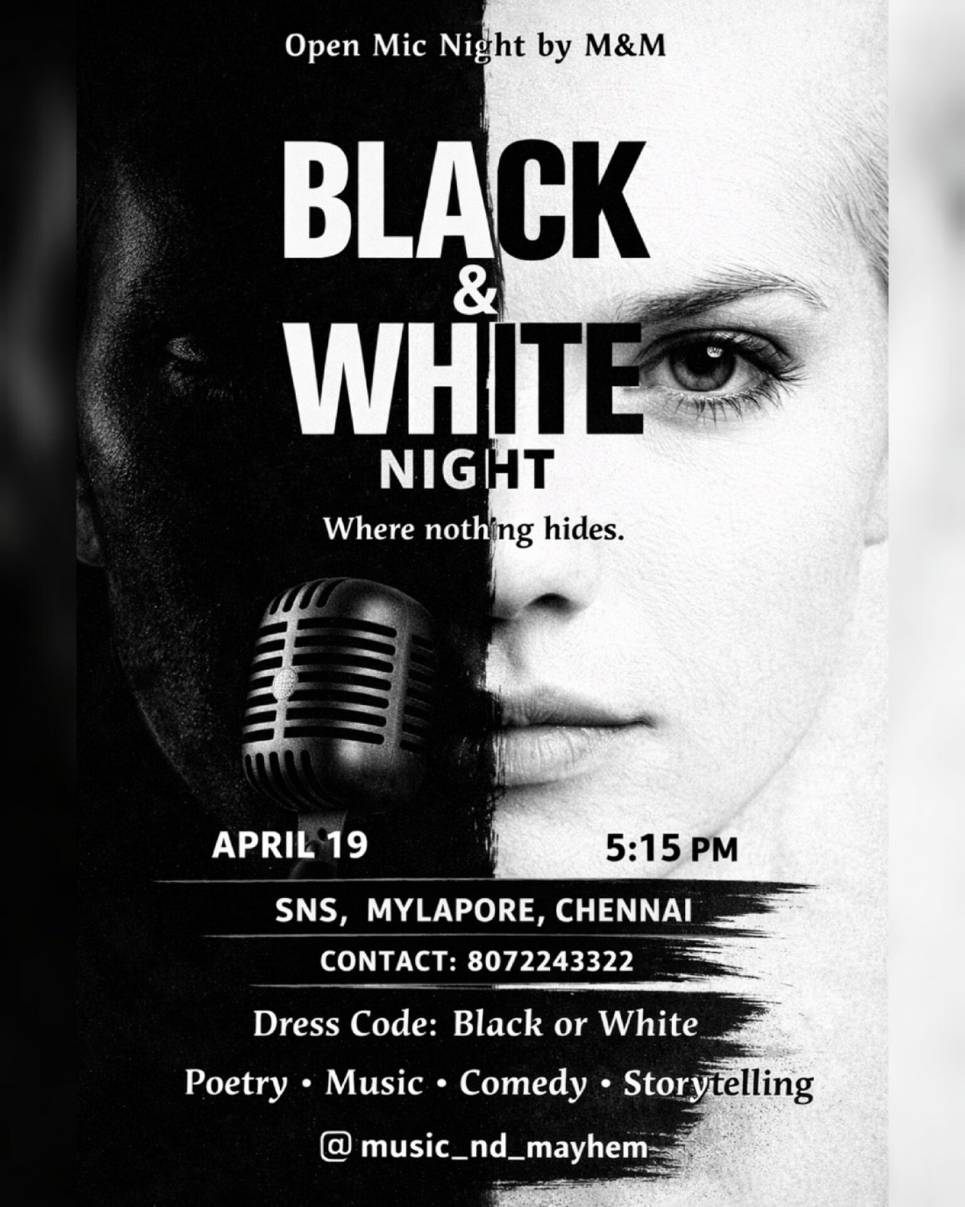 #BlackAndWhiteNight #OpenMicChennai #ArtWithoutFilters #SpokenWordIndia #LiveArt