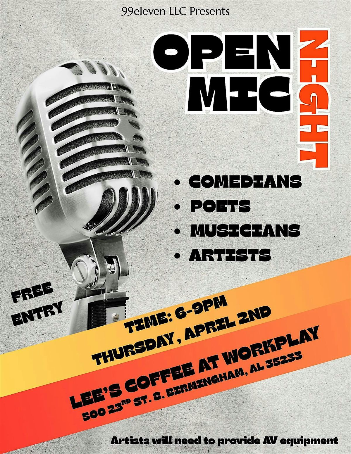 All Comedians, Poets, Musicians, Artists of all kinds; the mic is calling your name!!