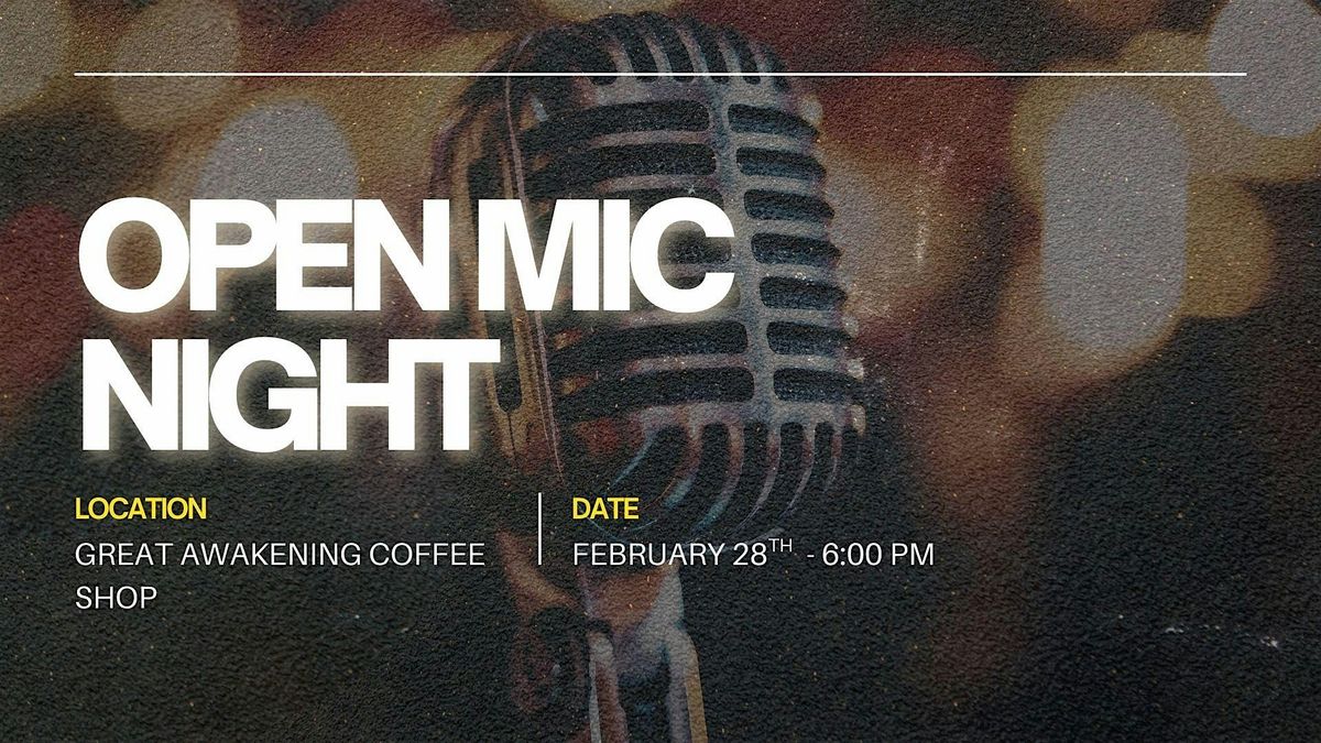 Saturday February 28th we will be hosting an Free Open Mic Night at the Great Awakening Coffee Shop.