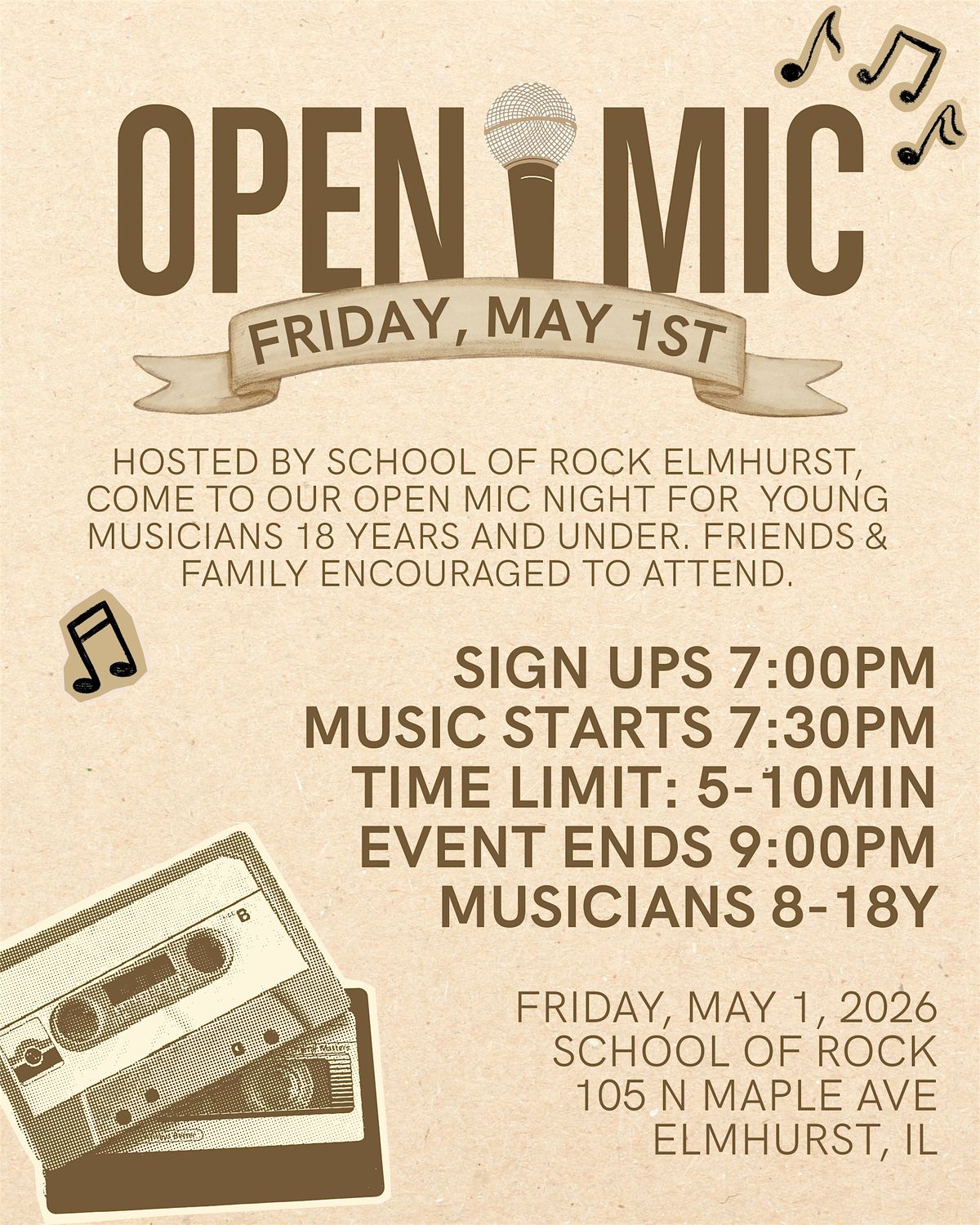 Join us at School of Rock Elmhurst for an Open Mic Night on Friday, May 1st. This open mic night highlights the talented young musicians in our community, giving kids aged 8-18 a chance to showcase the music they love.