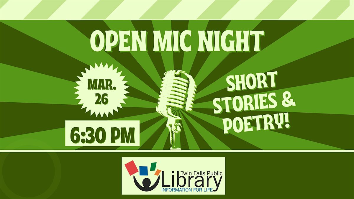 Visit the Twin Falls Public Library on March 26th at 6:30 PM for a night of short stories & poetry. Come and share your own writings or your favorite pieces by other authors, or just come to listen! Sign-up is first come, first to read. 5 minute time limit per reading (multiple readings are allowed, depending on time), no outside amplification or music allowed. Check with a librarian for more information.