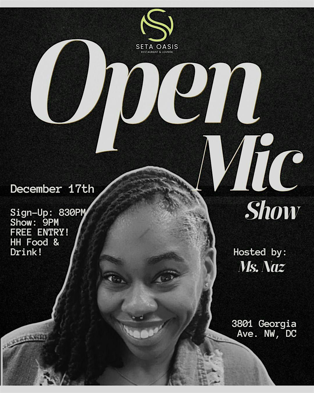 Join us every Wednesday at Seta Oasis (Black-Owned) for a welcoming, creative, and high-energy open mic night! Sign-up starts at 8:30 PM, show runs 9–11 PM.