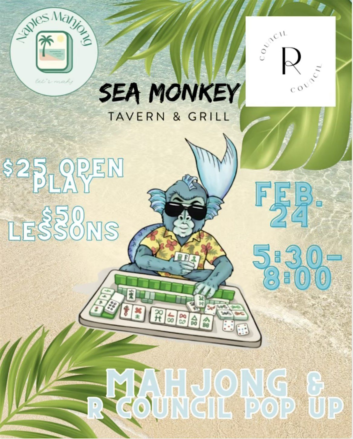 Join us for a relaxed and social open play Mahjong event at Sea Monkey with R Council. This gathering is perfect for all looking to enjoy a fun evening of Mahj in a beautiful setting.
