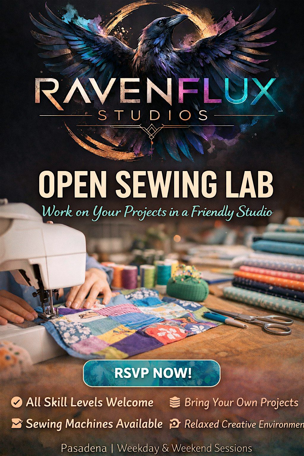 RavenFlux Studios is a small creative workshop space designed for hands-on learning and making. Open labs are intentionally kept small so everyone has room to work and ask questions.