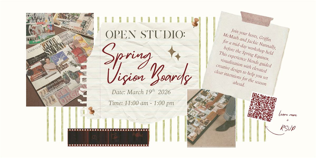 Join Griffin McMath and Jackie Nunnally for Open Studio: Spring Vision Boards, a mid-day workshop held before the Spring Equinox. This experience blends guided visualization with intentional creative design to help you set a clear direction for the season ahead.