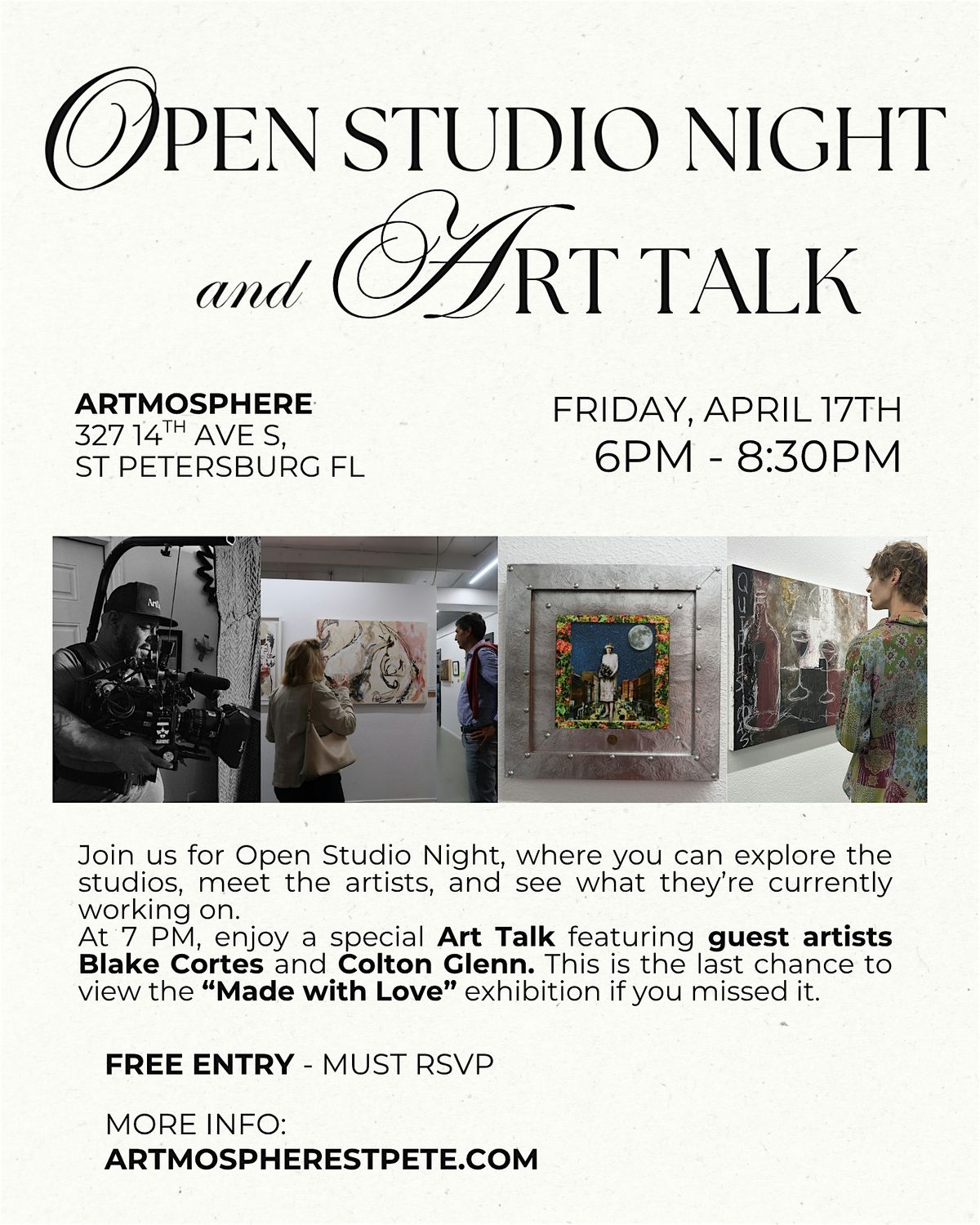 We’re excited to invite you to our Open Studios Night + Art Talk at Artmosphere on Friday, April 17th, 2026 at 6:00 PM (Eastern Time). This continues our newest tradition, our Art Talk (7pm) at ARTMOSPHERE ST. PETE – Art Gallery & Studios!