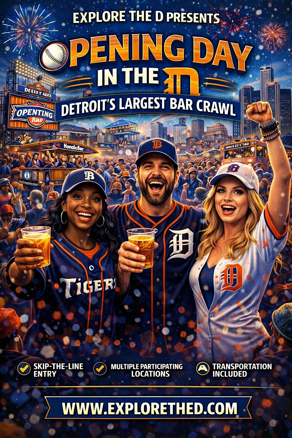 Opening Day in the D brings together thousands of Tigers fans, locals, and visitors for a massive bar crawl celebrating baseball, beer, and Detroit pride across the city’s top nightlife districts.