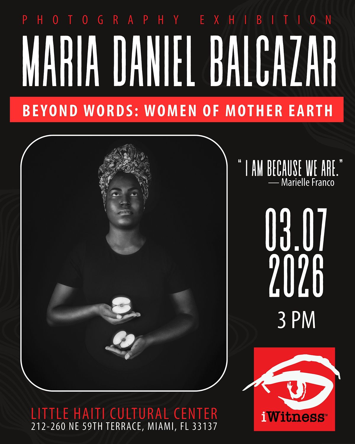 Don’t miss an inspiring artist talk with acclaimed fine art photographer and iWitness Fellow Maria Daniel Balcazar—an artist whose evocative work reimagines feminine archetypes and celebrates women’s stories across cultures on Sunday, March 8, 2026 from 2 p.m till 4 p.m. inside Little Haiti Cultural Complex gallery space.