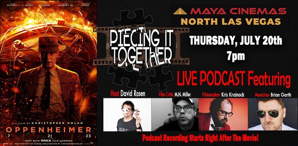 On Thursday, July 20th at 7:00pm at Maya Cinemas in North Las Vegas, NV, after a screening of Christopher Nolan’s Oppenheimer, the Piecing It Together Podcast will discuss the films that may have helped inspire this explosive (hey-o!) drama featuring an all star cast including Cillian Murphy, Robert Downey Jr., Matt Damon, Emily Blunt, Florence Pugh and many more. Oppenheimer is the story of American scientist J. Robert Oppnheimer and his role in the development of the atomic bomb. Joining host David Rosen to discuss the film are filmmaker Kris Krainock, film critic M.N. Miller, and musician Brian Garth.Movie starts right at 7pm so get there early for prizes and we’ll be starting the podcast recording right after the film!