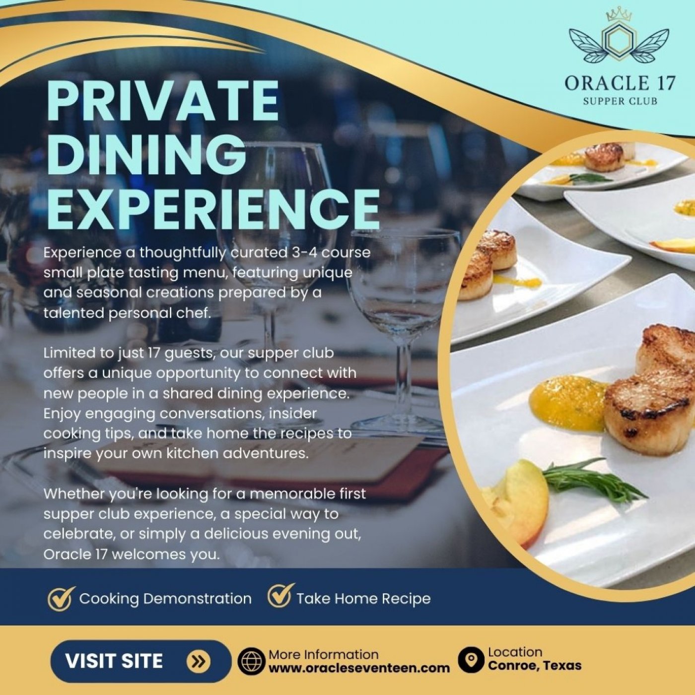 Enjoy engaging conversations, insider cooking tips, and take home the recipes to inspire your own kitchen adventures. Whether you're looking for a memorable first supper club experience, a special way to celebrate, or simply a delicious evening out, Oracle 17 Supper Club welcomes you.