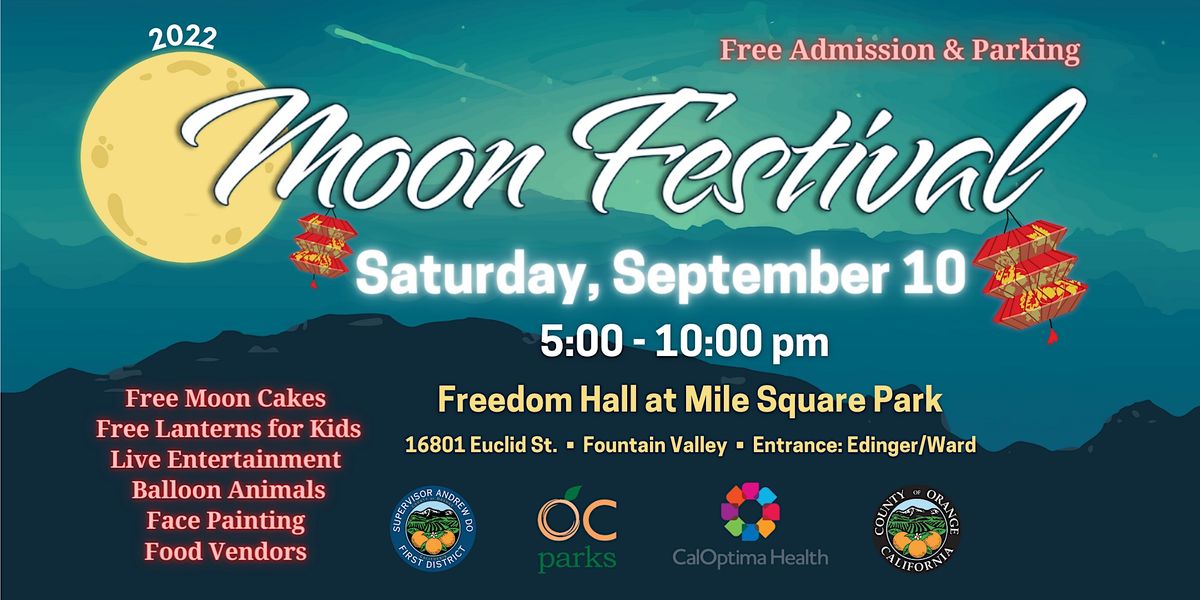 Join Orange County in celebrating the 2022 Moon Festival with live entertainment, moon cakes, and lanterns for children at Mile Square Park on Sunday, September 10.
