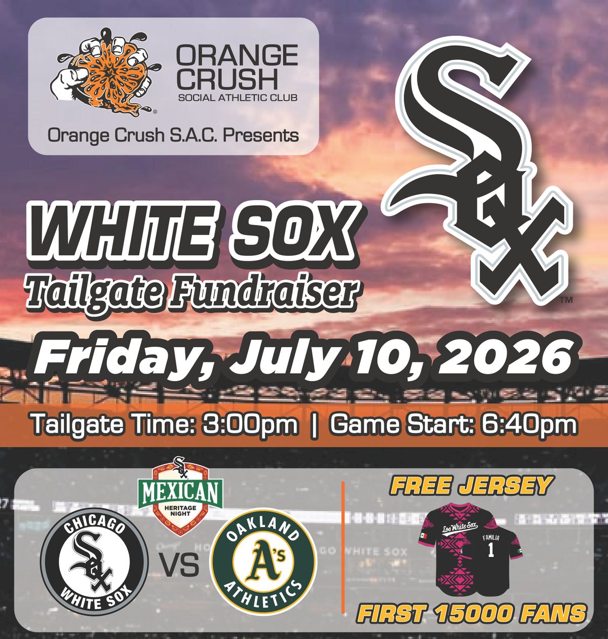 Welcome to the **Orange Crush S.A.C. - WHITE SOX Mexican Heritage Tailgate Fundraiser**! Join us at Guaranteed Rate Field on **Fri Jul 10 2026** at **3:00 PM** for a fun-filled event celebrating Mexican heritage. Enjoy delicious food, drinks, music, and games while supporting a great cause. Let's come together to show our pride and support for our scholarship fund. Don't miss out on this exciting opportunity to connect with fellow fans and make a difference. See you there!