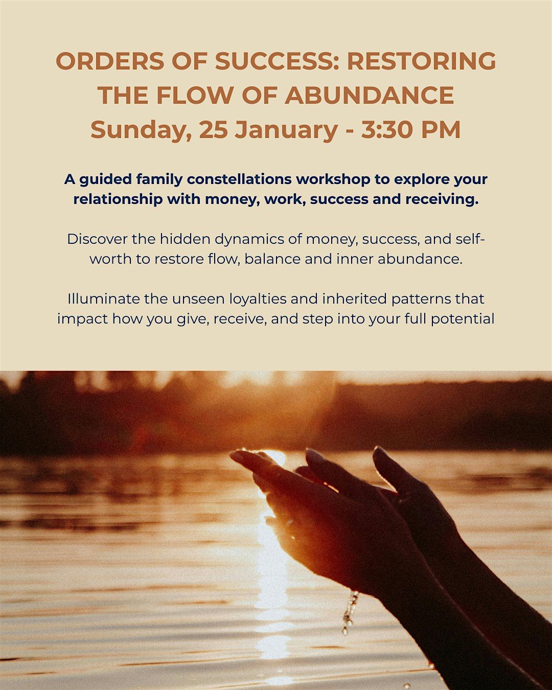 Orders of Success: Restoring the Flow of Abundance is a Family Constellations workshop exploring our relationship with money, work, success, and receiving.