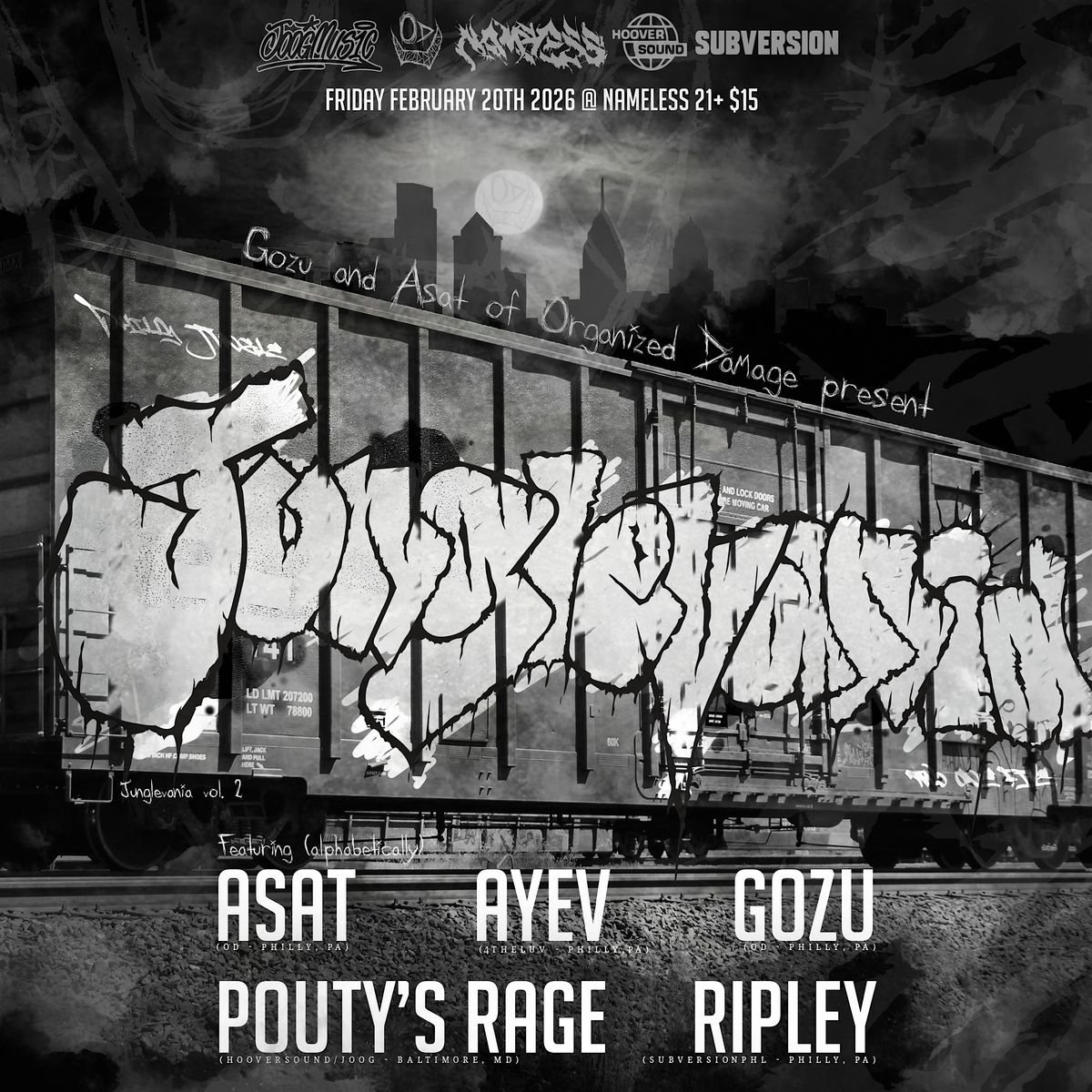 Join us on Friday, February 20, 2026 at Nameless for the second Junglevania hosted by Gozu and Asat of Organized Damage. This is a night dedicated to the full spectrum of jungle music, connecting the old school to the new. From hardcore to breakcore, jungle tekno to techstep, ragga to atmospheric, we intend to showcase the many faces of jungle to build community and connect with the greater US jungle scene.