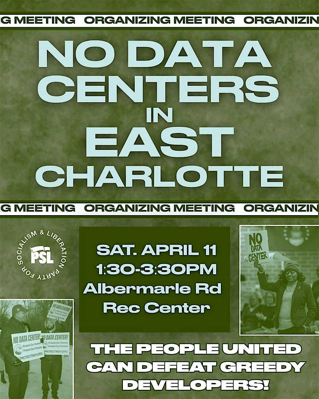 American Tower Corporation, a multibillion dollar real estate firm, wants to build a 50,000 square foot data center in East Charlotte, home to a large portion of our immigrant community. If built, it will impact the community's utility bills and have catastrophic environmental impacts. All across the country, communities are organizing to stop data centers from being built. Recently, residents in Matthews stopped a proposed data center—we can do the same!