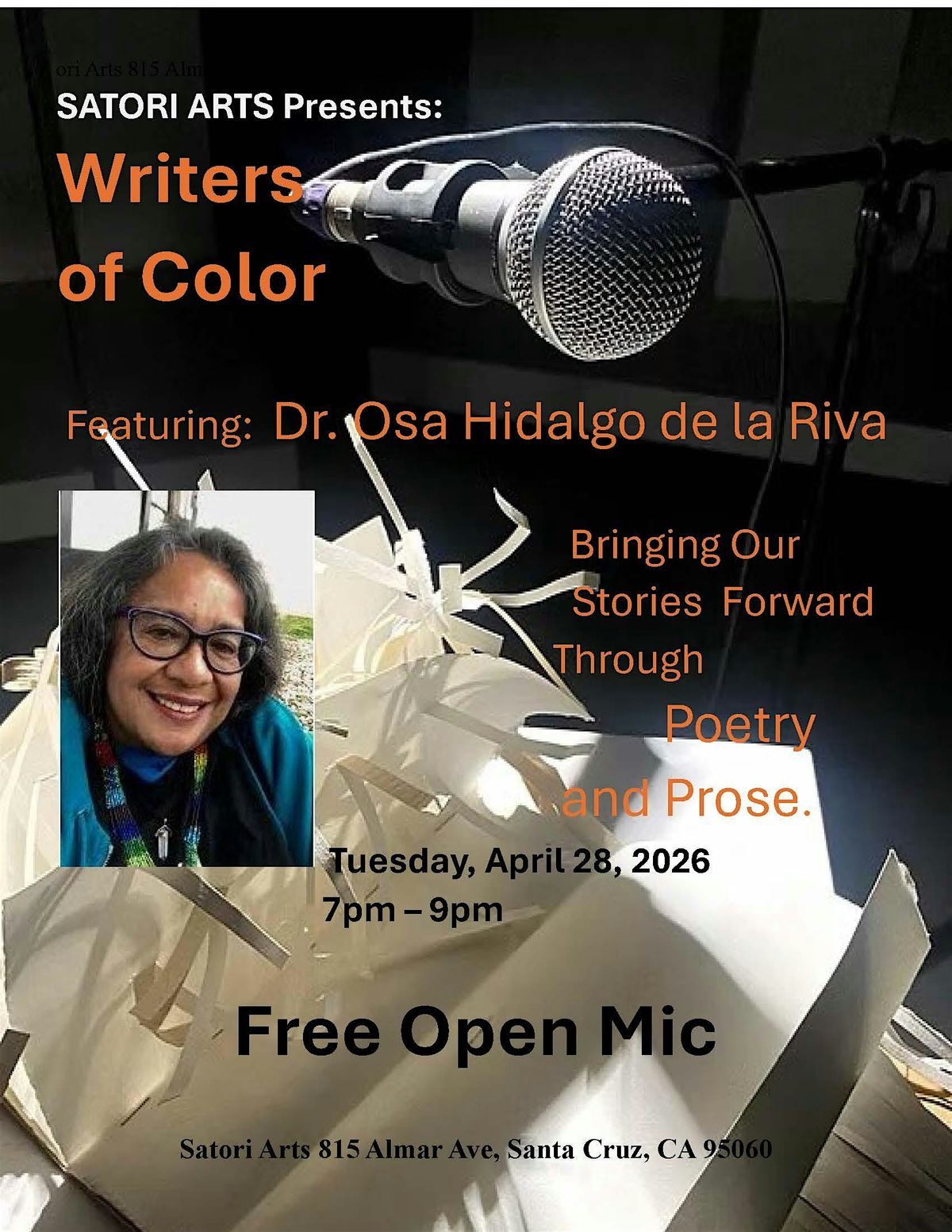 Join us in person at Satori Arts Santa Cruz for an engaging session with author Osa Hidalgo de la Riva. Dive into her creative world, hear stories behind her work, and get inspired. Perfect for literature lovers and curious minds alike. Don’t miss this chance to connect and chat directly with Osa! All writers and poets are invited to share their work during OPEN MIC.