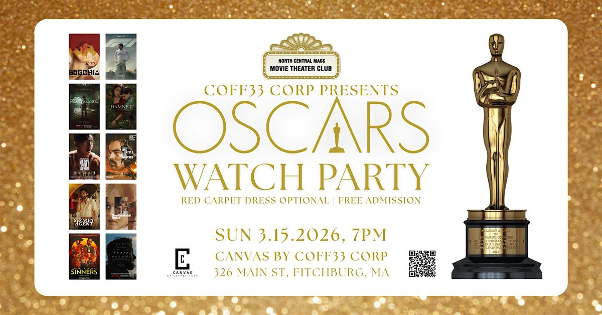 The North Central Mass: Movie Theater Club invites you to walk the Red Carpet. The bar will be open with speciality drinks ! Enjoy free Oscar-themed food! Vote on your favorite movies of 2025 and predict who will win? Red Carpet dress is optional. Attendee awards will be given out. Will you win Best Dressed?