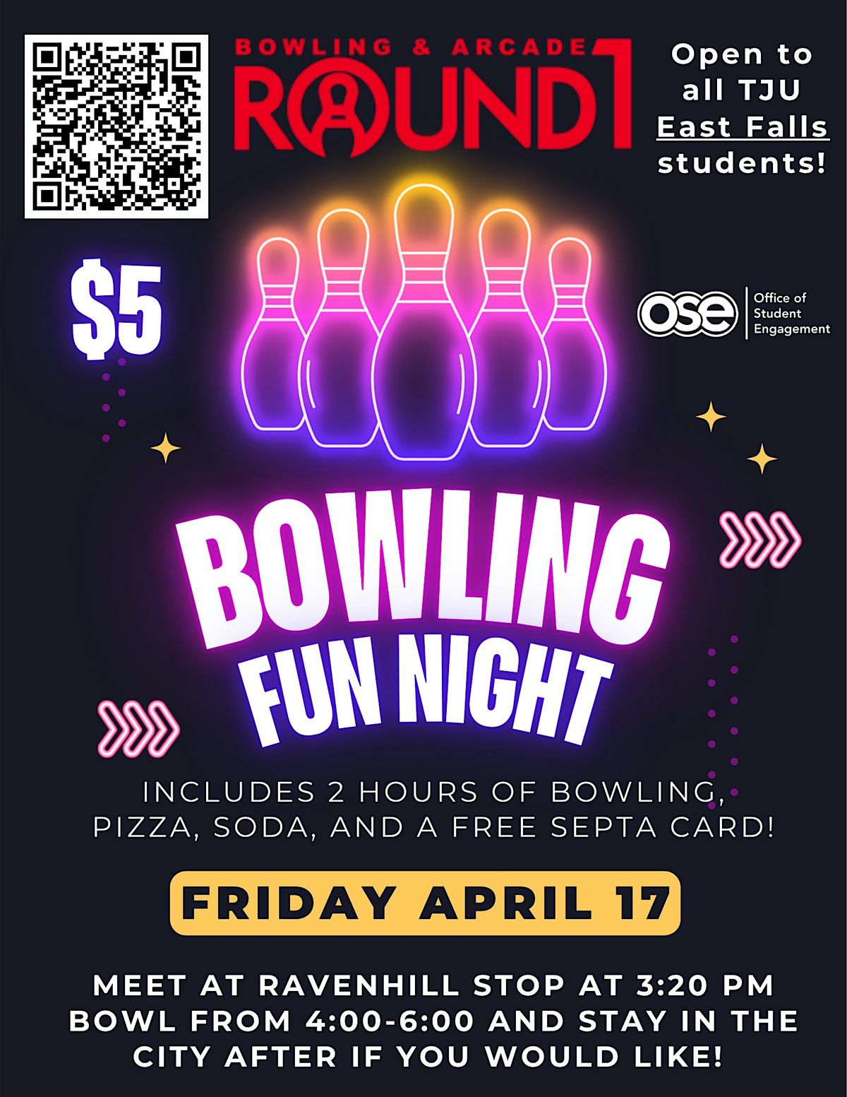 OSE is going bowling @ Round1 at the Fashion District mall. Stay as long as you like!