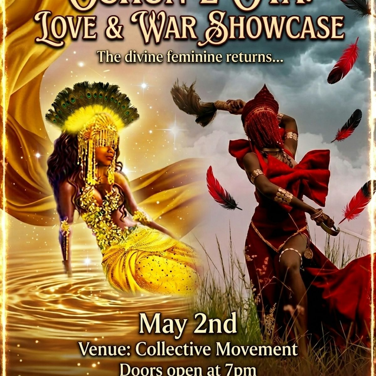 Get ready for an unforgettable night celebrating the powerful vibes of Oshun and Oya — the fierce forces of love and war. This in-person event brings together soulful performances, vibrant energy, and a community ready to embrace passion and strength. Don't miss out on this unique experience where emotion meets power in a spectacular showcase!