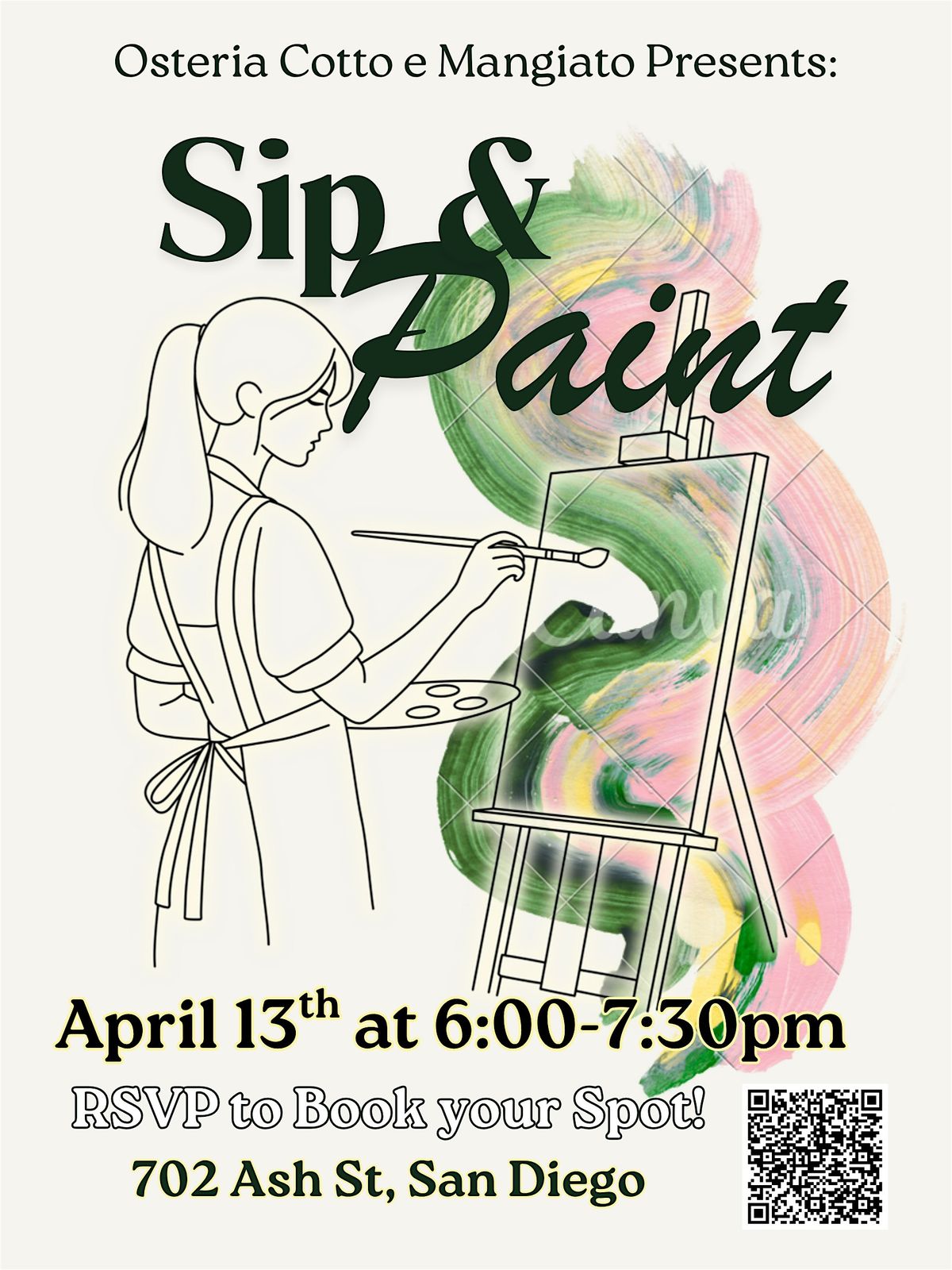 Get ready for a super chill night at Osteria! Join us for Sip and Paint — an awesome in-person event where you can unleash your creativity while enjoying your favorite drinks. Whether you're a painting pro or just here to have fun, this is the perfect way to relax and meet new people. Grab your pals, bring your vibes, and let's make some art together!