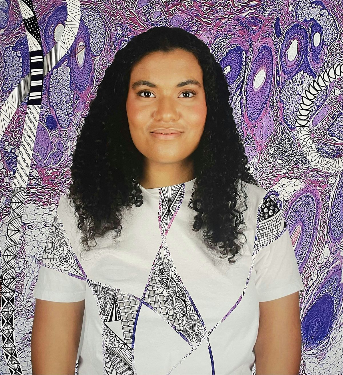 The middle layer consists of a portrait of a biracial model wearing a white T-shirt, emphasizing presence and individuality. The final layer incorporates hand-drawn zentangle patterns that swirl around each figure, evoking the visual language of DNA strands, genetics, and biology—symbolically intertwining science, identity, and lived experience.