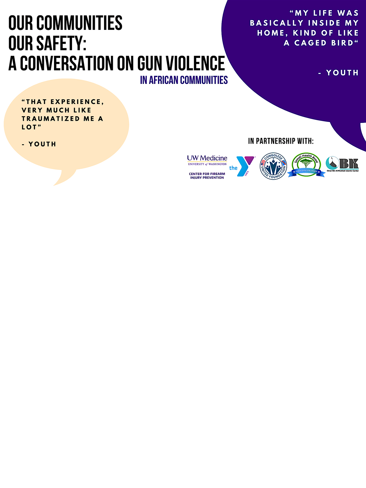 Hosted by the University of Washington’s Center for Firearm Injury Prevention and community partners, the Gun Violence in African Communities (GVAC) team will share key findings from their recent research, including surveys of over 200 youth and focus groups with Congolese, Somali, and Ethiopian community members. These insights will help ground our discussion in the lived realities of our communities.