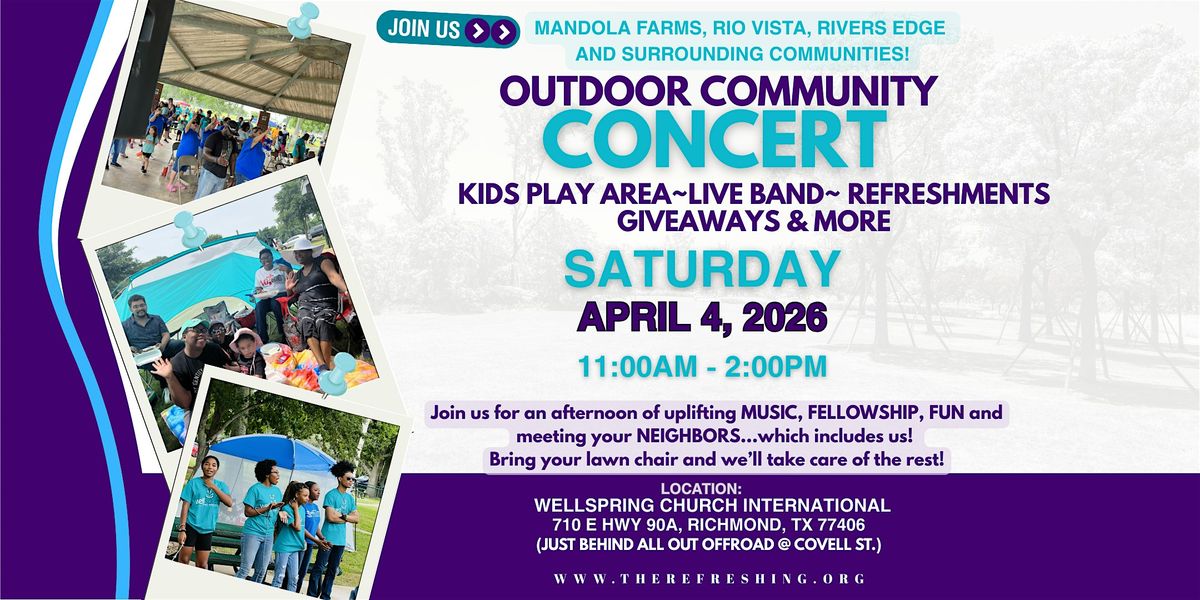 Join us for a vibrant outdoor concert this Saturday at Wellspring Church International! We’re excited to bring our community together for an evening filled with music, laughter, and fun. There will be games, giveaways, snacks and more. This is a fantastic opportunity to enjoy live performances, hear inspiring stories of overcoming challenges, connect with neighbors, and celebrate the spirit of unity in our community.