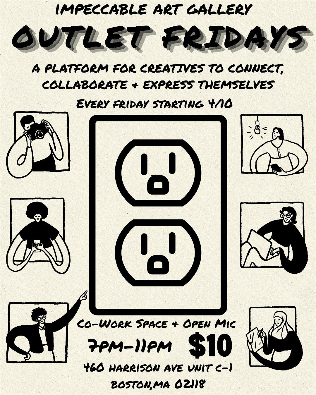 #OutletFridays #ImpeccableArt #CreativeCommunity #BostonCreatives #OpenMicVibes #CoWorkCulture #ArtMeetsCulture