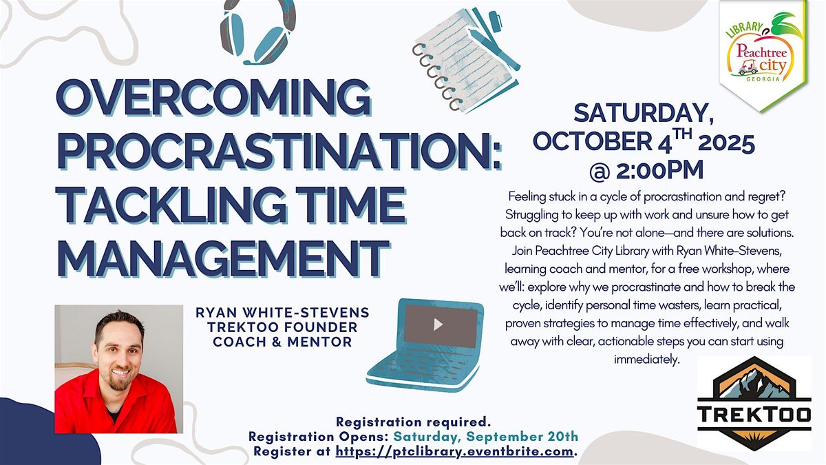 Feeling stuck in a cycle of procrastination and regret? Struggling to keep up with work and unsure how to get back on track? Youβre not aloneβand there are solutions. Join Peachtree City Library with Ryan White-Stevens, learning coach and mentor, for a free workshop, where weβll: explore why we procrastinate and how to break the cycle, identify personal time wasters, learn practical, proven strategies to manage time effectively, and walk away with clear, actionable steps you can start using immediately. This is event is free and open to the public. Registration required.