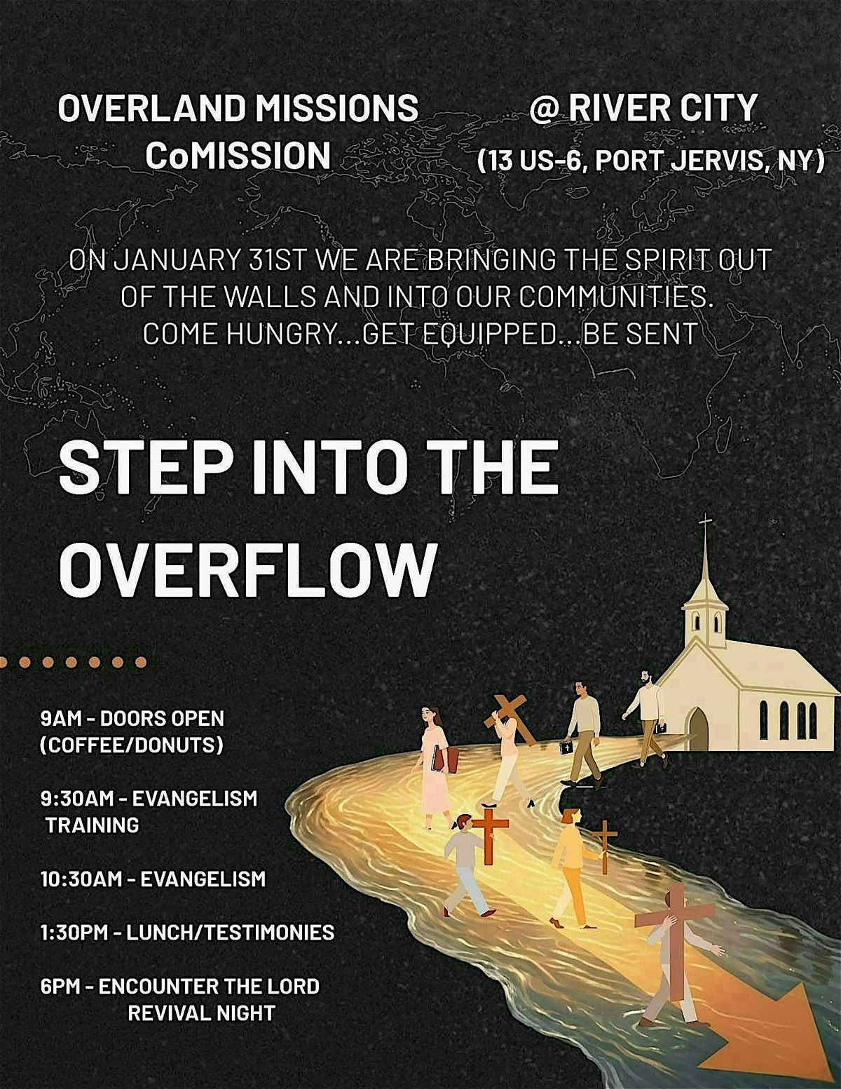 Then come back at 6pm that evening to Encounter the Lord as we worship Him and hear testimonies about what Jesus is doing through Overland Missions both overseas and right here in our Tristate area.