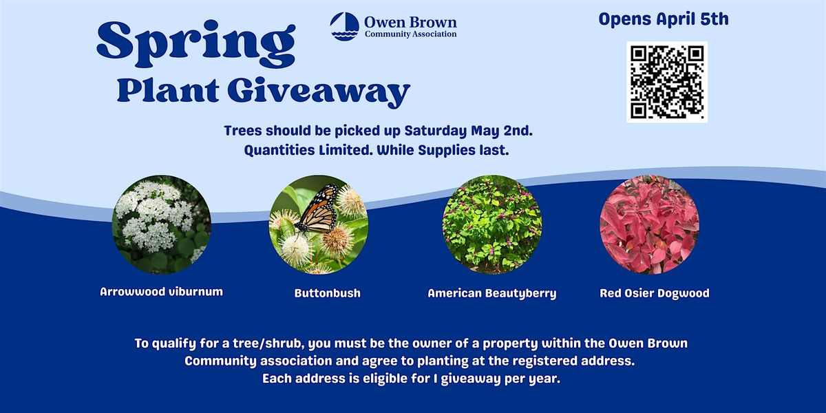 Spring into the Season with a tree or shrub! To qualify for a free tree, you must be a property owner in the Owen Brown Association and agree to install the tree on your OB property, soon-after taking possession. Trees should be picked up May 2nd at the Owen Brown Community Center