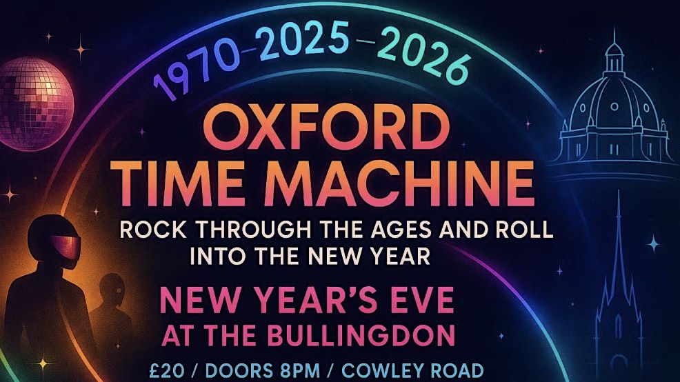 We’re taking over The Bullingdon – Cowley Road’s legendary live music and club venue — and turning it into a full-blown Time Machine. From 10pm until late, you’ll step through the decades, dance through the eras, and count down to midnight in a way Oxford has never seen before.