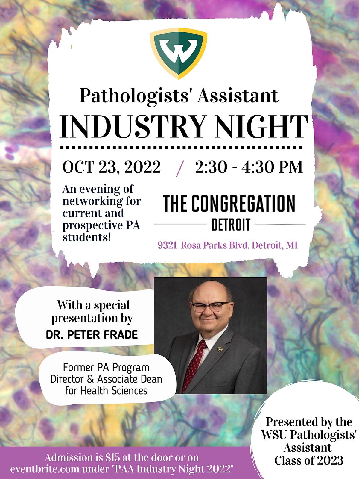 Join current Wayne State Pathologists' Assistant students and faculty at Industry Night on Sunday, October 23, from 2:30 - 4:30 pm for an evening of mingling with working pathology professionals! Prospective students can have the chance to talk with current students, program staff, and certified PA's working throughout Michigan, and gain valuable insight into the world of a Pathologists' Assistant. Our honored guest speaker is Dr. Peter Frade, Professor Emeritus and former PA Program Director at Wayne State.
