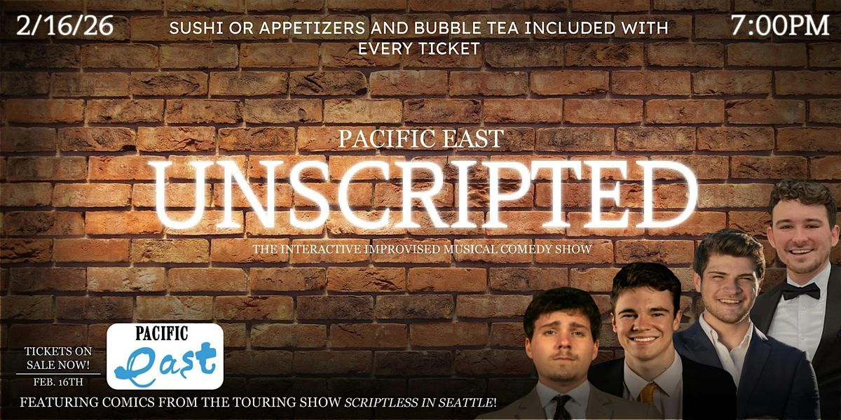 Join us for an unforgettable night of laughter as Pacific East transforms into an intimate comedy club! Featuring four nationally touring comedians from the hit show Scriptless in Seattle, this fast-paced, interactive “Whose Line”-style performance blends quick wit, musical comedy, and audience participation into a one-of-a-kind evening. No scripts, no safety nets—just pure, unscripted hilarity. This is a family-friendly event.