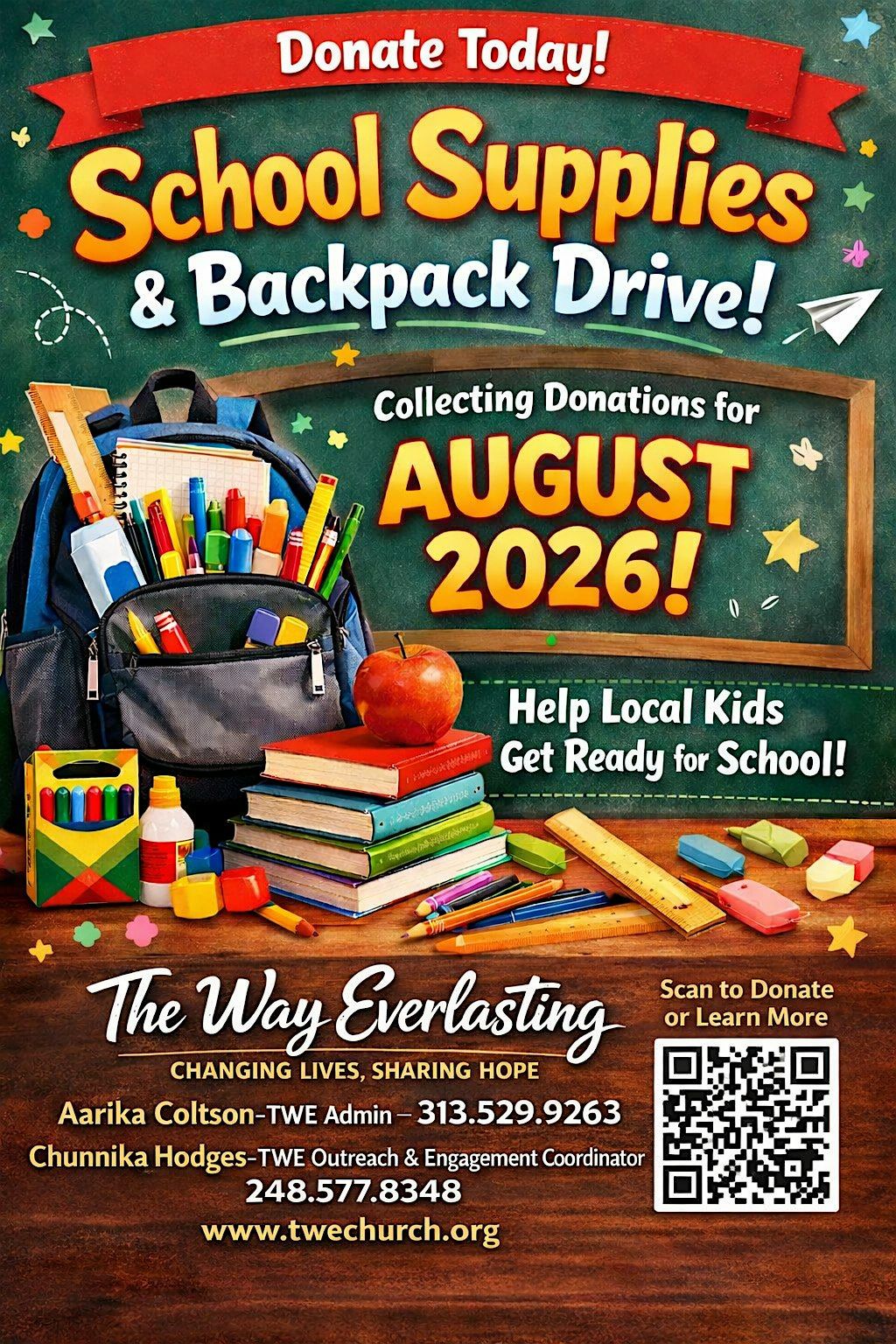 The Way Everlasting Church is collecting school supplies and backpacks throughout the month of August 2026 to support local children and families in our community.