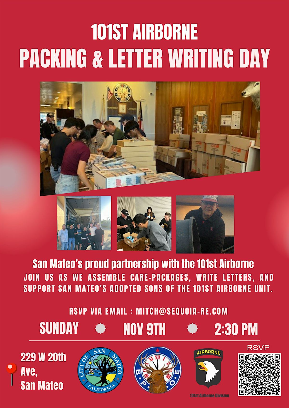 Join us on Sunday, November 9th at 2:30 PM at the San Mateo Elks Club for our annual Packing Day with the 101st Airborne. Together, we’ll assemble care packages and write letters to support the 101st ABU—the unit San Mateo has proudly sponsored since the Vietnam War.