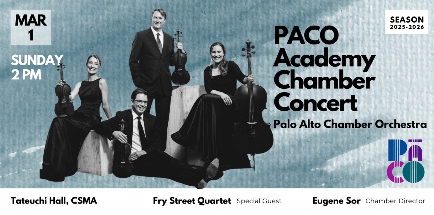 Get ready for an extraordinary musical week at PACO! We are absolutely thrilled to announce that the acclaimed Fry Street Quartet will embark on a captivating one-week chamber music residency with the Palo Alto Chamber Orchestra (PACO), running from February 23rd to March 1st. This unique collaboration promises an immersive experience, featuring insightful side-by-side presentations, a free and public masterclass, all culminating with the Fry Street performing on our PACO Academy Chamber Concert. Don’t miss this incredible opportunity to witness world-class artistry and educational engagement right here in Palo Alto as we show the world how to play with others!