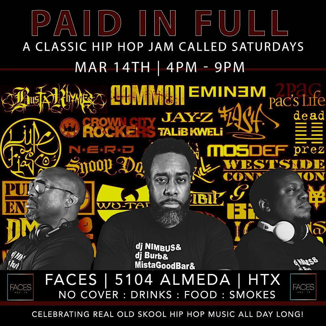 Paid In Full is home of the realest Hip Hop Classics in Houston! dj NIMBUS, dj Burb & Mista Goodbar always bring the heat from the east, slide through the streets of the westcoast, dip up the midwest before swanging and banging down south, with a lil bounce from the boot, and that bass from Miami! We hit all the corners of classic & underground hip hop! We are for those who listened to more than just the radio, those who had the tape, cd, or vinyl and banged the B-sides! Drop in and enjoy a blast from the past with grown folks who enjoy quality vibes! Faces offers plenty of parking, indoor & outdoor seating, cigar & hookah available on patio, and food on premises! No cover, casual hip hop wear encouraged!