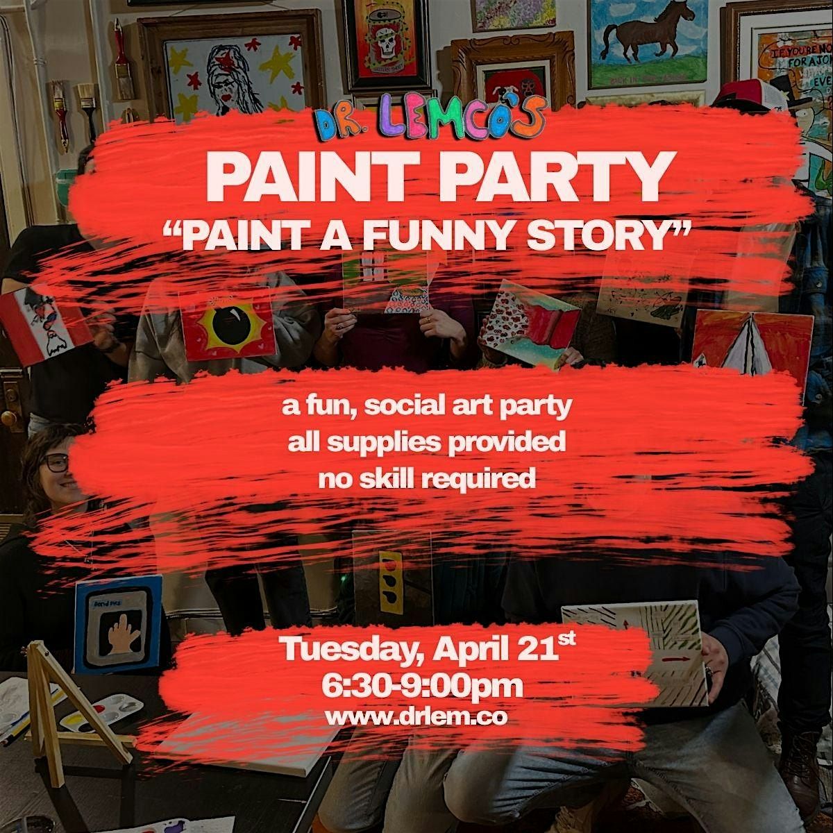 Get ready to make art, have fun, and feel good at Dr Lemco's Paint Party: Paint A Funny Story! You'll create something that represents your most hilarious tale, with the option to "show & tell" your artwork at the end. All supplies are provided, and no skill necessary. This is the most you'll laugh at a painting event!