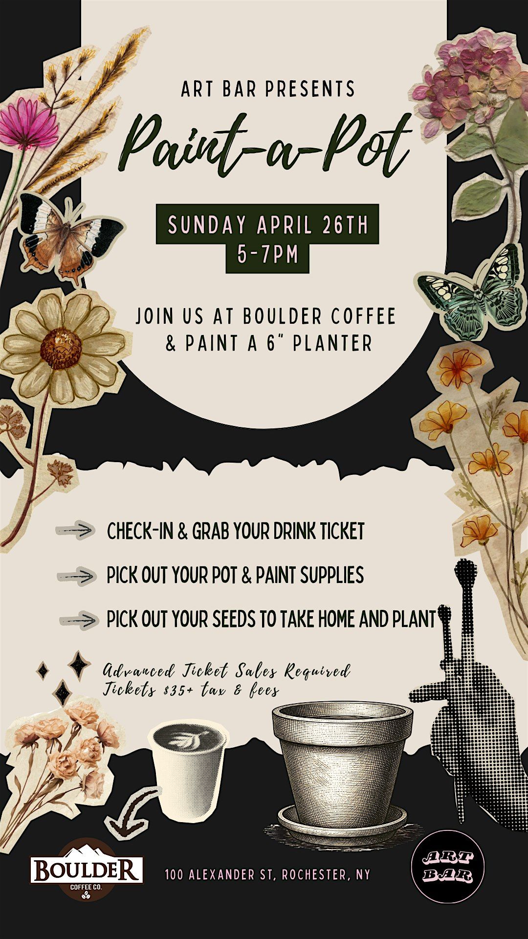 Tickets include a 6” terracotta clay pot, paint & supplies, choice of seeds to take home and a cafe drink ticket!