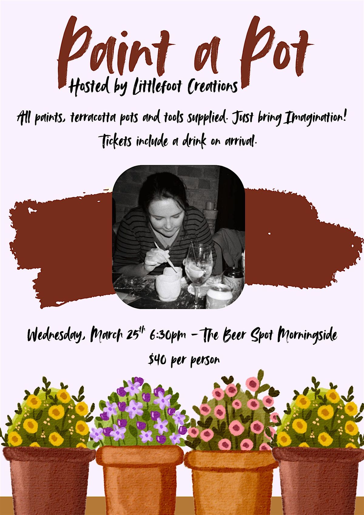 Come join us for a fun and creative evening at The Beerspot Morningside! At paint a pot, you can enjoy a relaxing atmosphere while sipping on NZ beverages and letting your creativity flow. Our talented instructor will guide you through painting your own masterpiece on a terracotta plant pot. No experience necessary - just bring yourself and be ready to have a great time! Don't miss out on this unique opportunity to unwind, socialize, and paint something amazing. Grab your friends and reserve your spot today! First drinks and all supplies included in ticket price.