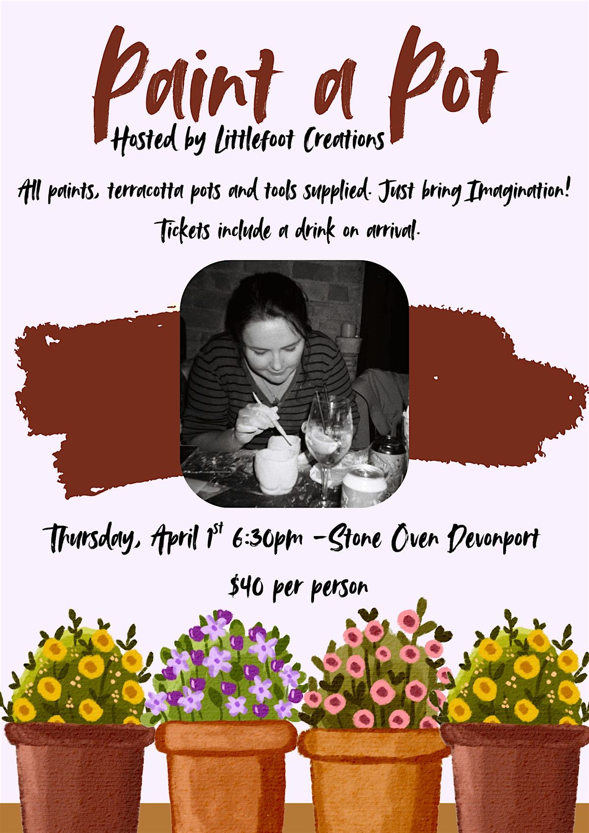 Come join us for a fun and creative evening at Stone Oven! At paint a pot, you can enjoy a relaxing atmosphere while sipping on NZ beverages and letting your creativity flow. Our talented instructor will guide you through painting your own masterpiece on a terracotta plant pot. No experience necessary - just bring yourself and be ready to have a great time! Don't miss out on this unique opportunity to unwind, socialize, and paint something amazing. Grab your friends and reserve your spot today! Tickets include first drink and supplies.