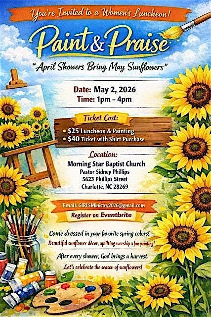 Paint & Praise is a spirit‑led luncheon designed to refresh the soul and awaken creativity. Centered on the theme “April Showers Bring May Sunflowers,” this gathering celebrates God’s renewal—how He uses life’s rains to grow something beautiful within us.