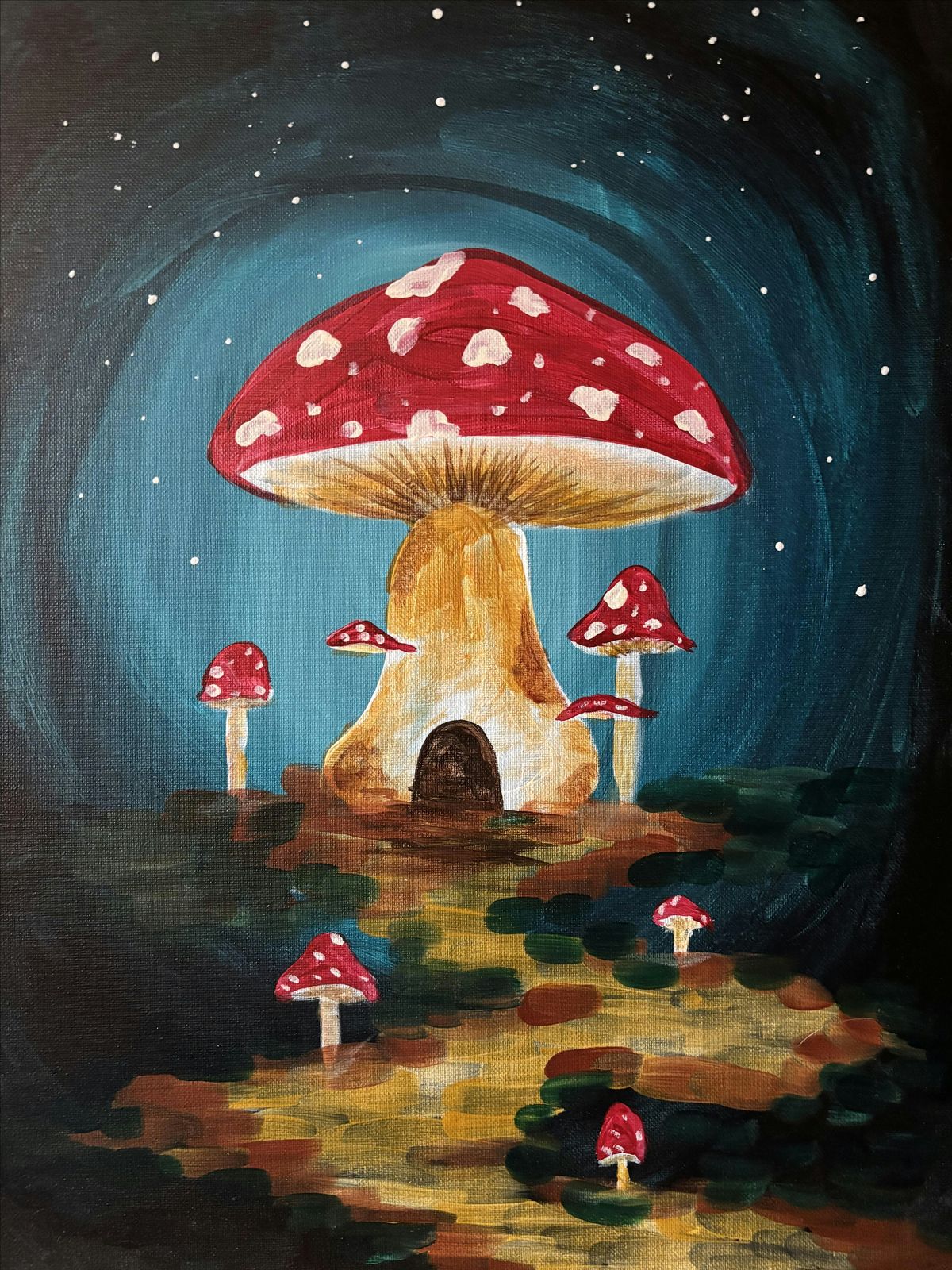 Come paint this fun mushroom house with us in Darby’s beautiful tasting room!