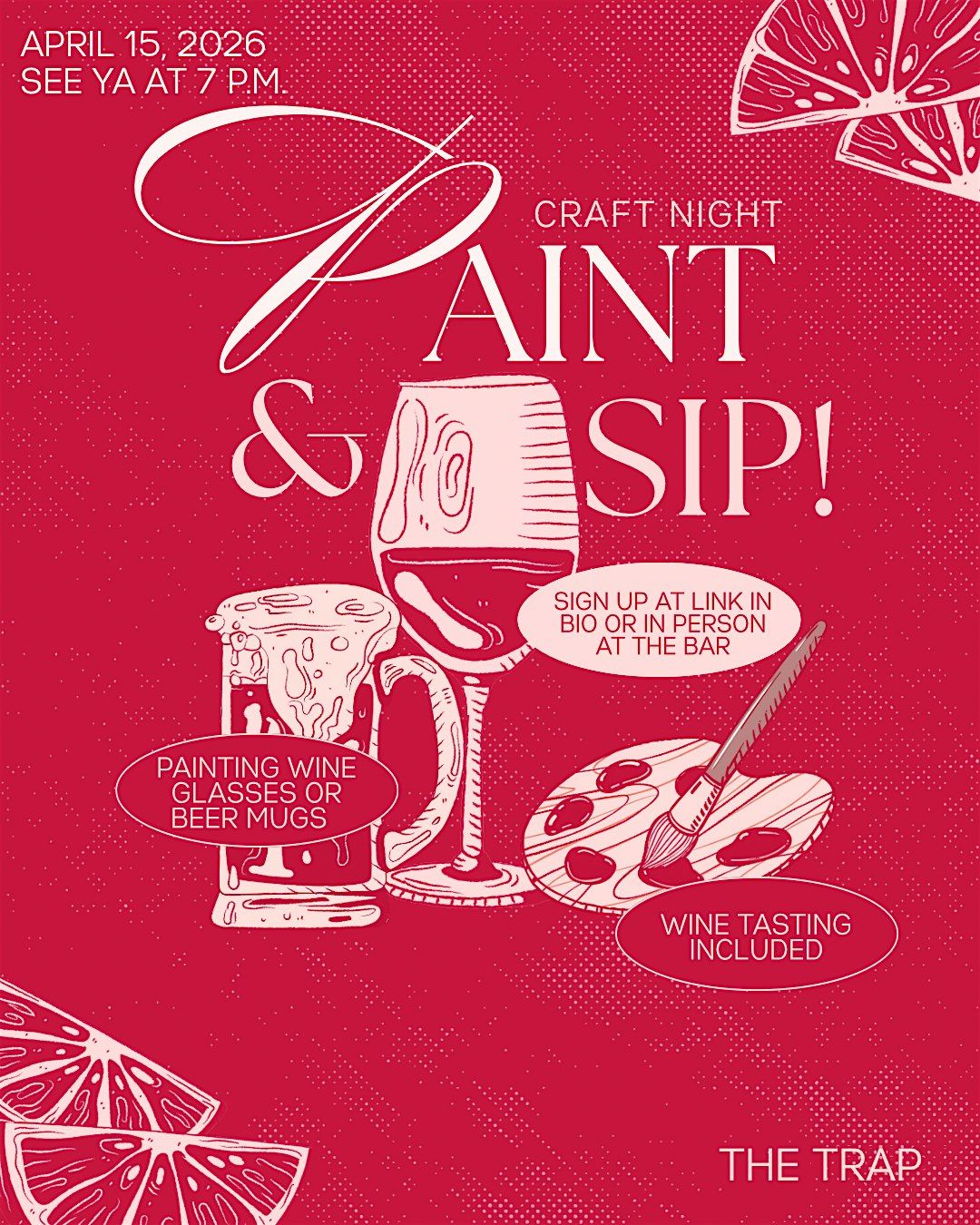 Paint & Wine Night at The Trap! Customize your own wine or beer glass (your choice) while enjoying a hosted wine tasting featuring a sparkling, cabernet, and white wine. Sip, paint, and unwind in a fun, social atmosphere—no experience needed. Perfect for a girls’ night, date night, or creative evening out. All supplies included. 🍷🎨