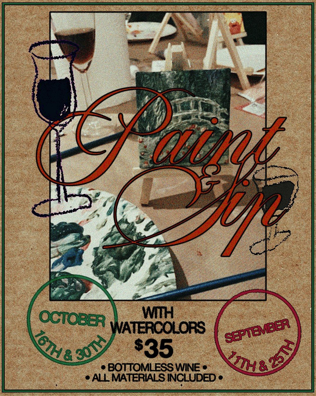 Join us for an evening of creativity and carefree indulgence every Thursday from 7:30 to 9:30 PM! Our Paint & Sip event invites you to let your artistic spirit soar while sipping on bottomless wine.