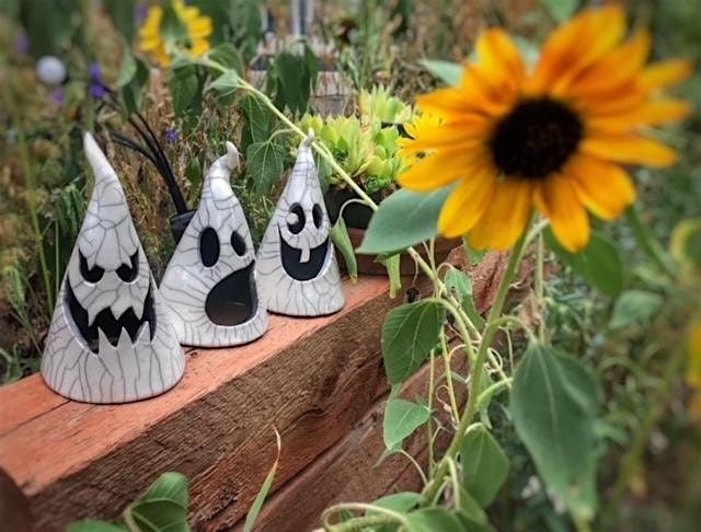 In this Frightenly Fun class students will paint 1 pre-made bisqued ghost using special Raku glazes and fire them up to 1800. After reaching 1800, ghosts will be pulled out of the kiln using protective safety gear and equipment and placed into a reduction chamber (trashcan full of combustibles). After 15 mins, Ghost will be removed, cleaned up and available to TAKE HOME! That’s right! Raku is the only ceramic firing process that you take your pots home the same night! Please show up 5-10 minutes prior to class