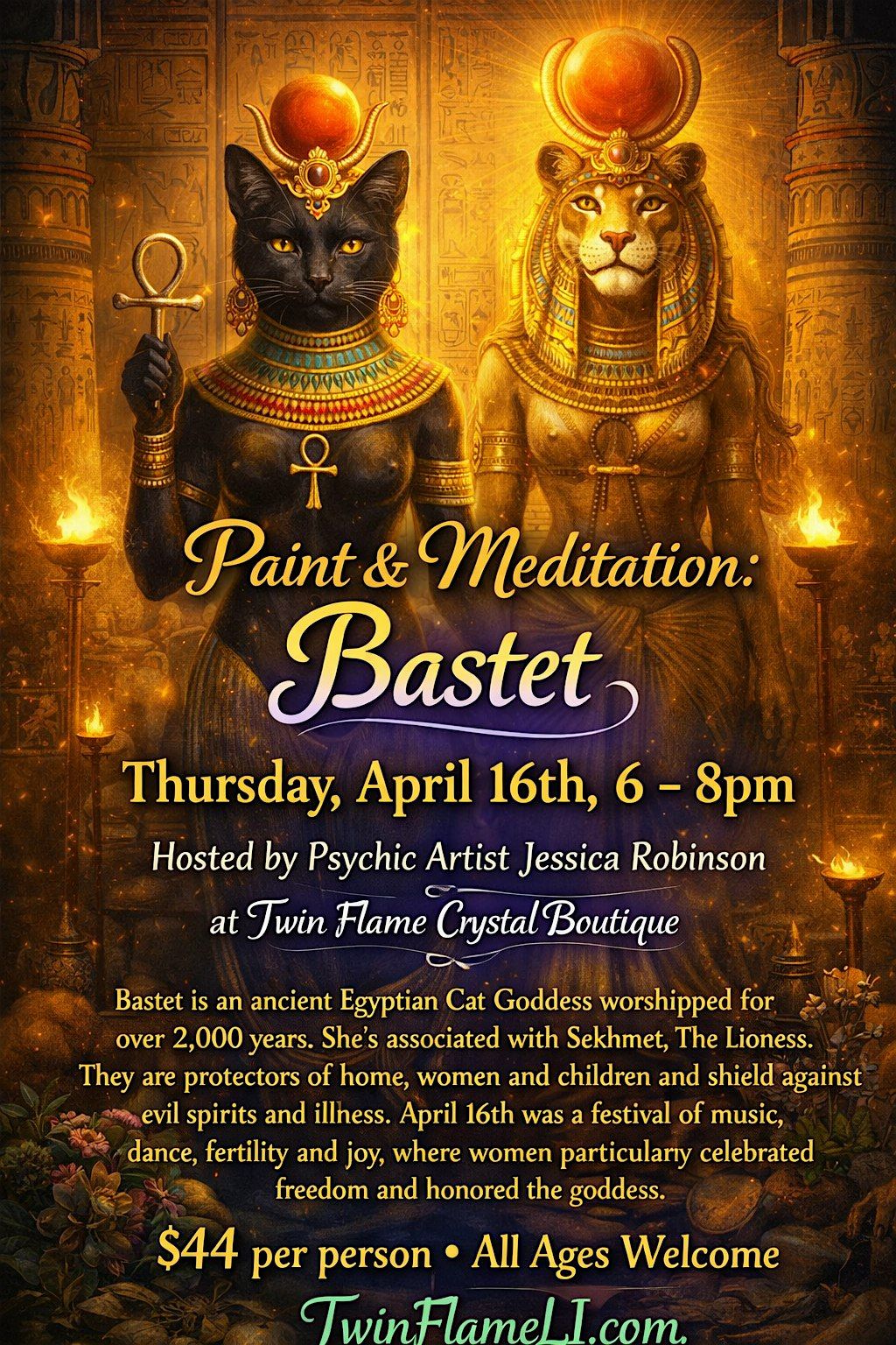 Bastet is an ancient Egyptian Cat Goddess worshipped for over 2,000 years. She’s associated with Sekhemet, The Lioness. They are protectors of home, women and children and shield against evil spirits and illness. April 16th was a festival of music, dance, fertility and joy, where women particularly celebrated freedom and honored the goddess. Bastet represents: