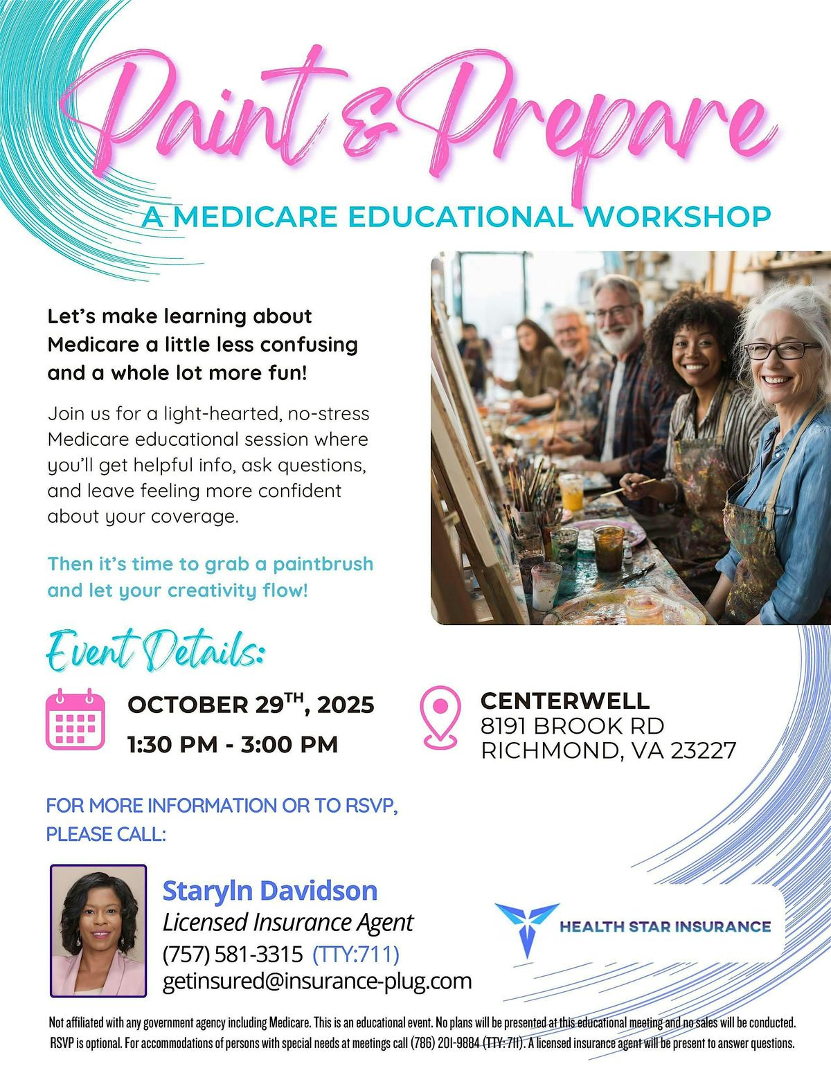 Welcome to the Paint & Prepare Medicare Educational Workshop! Join us at CenterWell Senior Primary Care on November 29, 2025 at 1:30 PM (Eastern Time) to learn all about Medicare. Get ready to dive into the ins and outs of this essential program. Don't miss this opportunity to get informed and prepared. See you there!