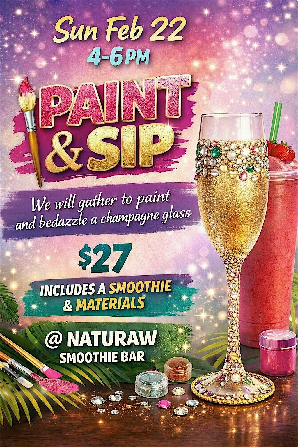 Welcome to Paint & Sip! Join us at 4133 Whitney Ave on February 22, 2026 at 4:00 PM (Eastern Time) for a fun evening of painting and sipping your favorite beverages. No experience necessary, just come ready to unleash your creativity! Grab your friends and get ready for a relaxing and enjoyable time. See you there!